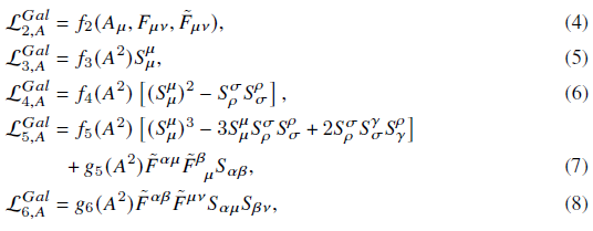 Como último paso, se realiza el reemplazo A μ → ∂ μ ϖ y se remueven los términos cuya acción resultante no corresponda a la de un Galileón escalar (o acción de Horndeski (Deffayet, C., & Steer, D., 2013; Nicolis, A., et al, 2009; Horndeski, H. W.,, 1974; Deffayet, C., et al, 2009a, 2009b)).