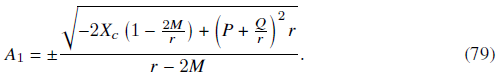 en donde Q es la carga asociada al campo vectorial y -2M es la constante de integración que, una vez se lleva al límite Newtoniano, se identifica como la masa del agujero negro. La solución obtenida es, por lo tanto, la de Reissner-Nordström: