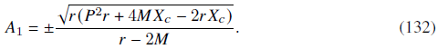 en donde P, 2M y Q son constantes de integración. De otra parte, dado que en el límite r →ꝏ se debe tener espaciotiempo plano, se deduce que C = 1. Insertando estas expresiones en (61) y (63) se obtiene la solución