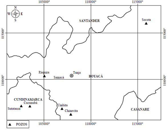 En Cundinamarca los pozos exploratorios de CBM se centraron en la zona minera de Checua-Lenguazaque, sobre el flanco occidental del sinclinal Checua-Lenguazaque en el bloque Tausa-Cucunubá. Los pozos son: Cucunubá 1, Cucunubá 2, Cucunubá 3 y Sutatausa 1. En Boyacá los pozos exploratorios están a lo largo del departamento y son el Ráquira 1, Samacá 1, Socotá 1, Socotá 2, Chinavita 1 y Úmbita 1 (Figura 1). Los cálculos de emisiones se hicieron a partir de los factores de emisión de nivel 1 y nivel 2 establecidos por el IPCC.