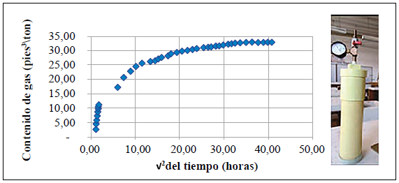 A continuación se explica el procedimiento de medición del gas en explotaciones de CBM: una vez que el corazón de la muestra de carbón se saca del pozo de exploración de CBM, se introduce inmediatamente en un contenedor hermético conocido como sistema de desorción canister siguiendo las indicaciones del método de la United States Bureau of Mines (USBM) (Diamond, 1981); el contenedor es trasportado al laboratorio para mantener la muestra a la temperatura del yacimiento durante el tiempo que tome la medición del gas desorbido; los datos se toman cada 24 horas para obtener los valores periódicos de desorción que serán graficados. El proceso de medición incluye tres métodos diferentes teniendo en cuenta que el contenido total del gas asociado al carbón es la sumatoria de tres componentes: 1) el gas perdido, que corresponde al gas que ha escapado del carbón entre el momento en que el manto de carbón es penetrado por la broca y en que la muestra es introducida y sellada dentro del contenedor; 2) el gas desorbido, es decir, el adsorbido en la matriz del carbón, que se determina empleando los contenedores en los que se introducen y sellan las muestras de carbón, los cuales son posteriormente conectados a la bureta para calcular la desgasificación del carbón abriendo la válvula que permite la salida del gas medido por el desplazamiento del agua en una columna volumétrica a temperatura ambiente y presión atmosférica ambiental a nivel del mar, lo que, acumulado, se grafica contra el tiempo (Figura 2); 3) el gas residual, o sea, el que permanece absorbido en la matriz del carbón después de que se ha completado la prueba de desorción. Este se extrae pulverizando la muestra en un molino hermético y midiendo la cantidad de gas con el sistema de bureta utilizado en la determinación del gas desorbido (Diamond & Levine, 1981). El contenido acumulado en pie3/ton se grafica contra la raíz cuadrada del tiempo en horas (Mojica & Mariño, 2013) (Figura 2).