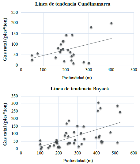 Figura 3 Línea de tendencia del incremento de contenido de gas con profundidad en Cundinamarca (superior) y Boyaca (inferior).