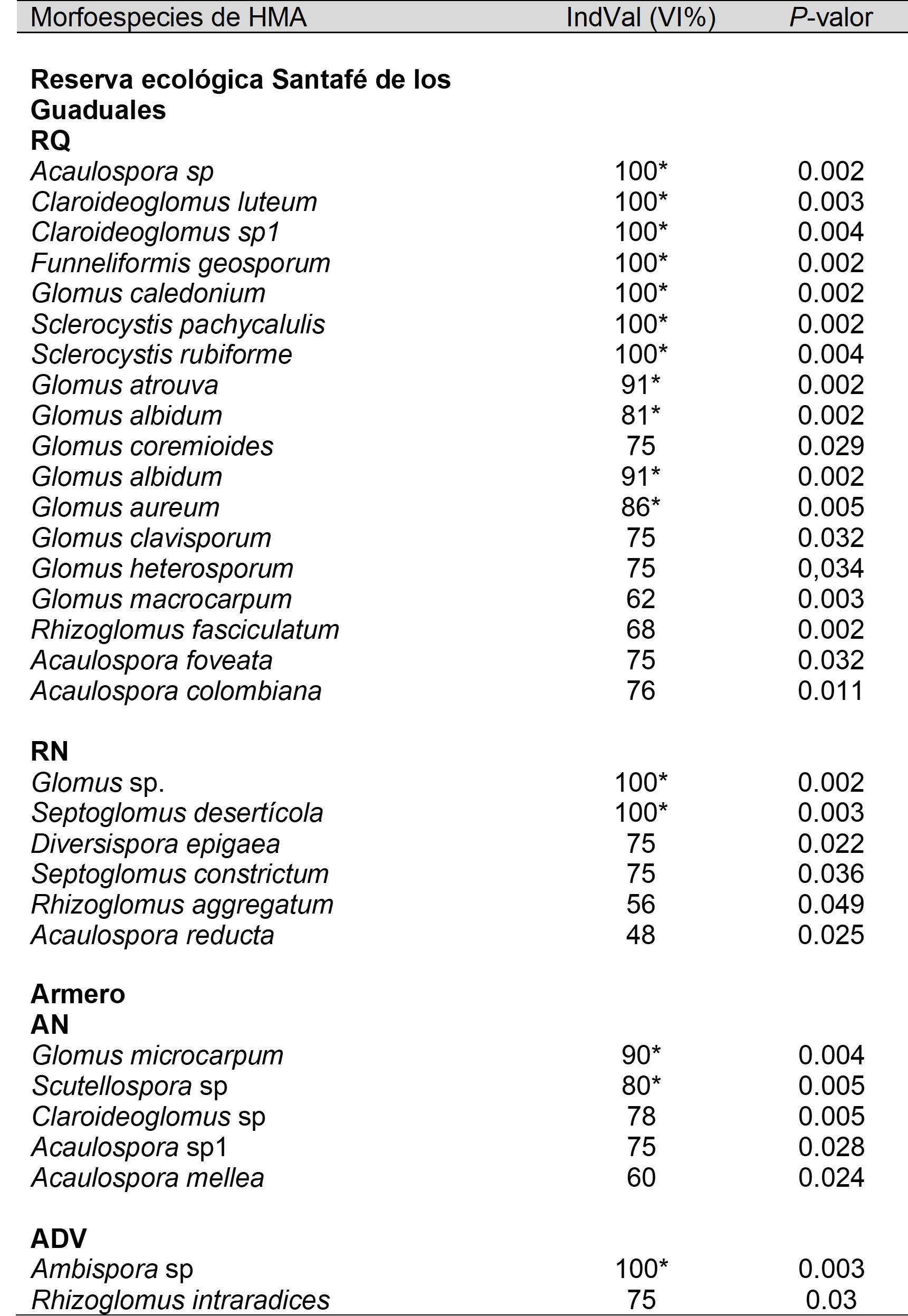 En la Reserva, RN presentó como morfoespecies indicadoras a Glomus sp. y Septoglomus desertícola; en RQ fueron Acaulospora sp, Claroideoglomus luteum, Claroideoglomus sp., Funneliformis geosporum, Glomus caledonium, Sclerocystis pachycaulis, S. rubiforme, Glomus atrouva, G. albidum y G. aureum. En la zona de Armero, las morfoespecies indicadoras de AN fueron G. microcarpum y Scutellospora sp., en tanto que en ADV fue Ambispora sp. (Tabla S1,https://www.raccefyn.co/index.php/raccefyn/article/view/1482/3154).