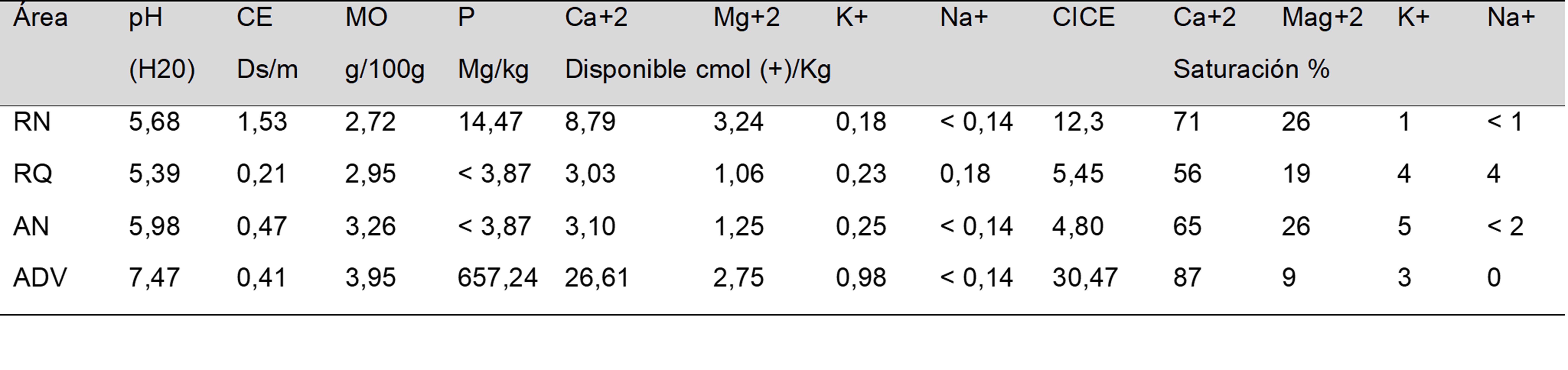 Los resultados indican que tres de las cuatro áreas de estudio (RQ, RN y AN) presentaron un pH ácido y solo ADV exhibió un pH alcalino y un alto contenido de P, K+, Mg2+, CICE y saturación de Ca2+. RQ se caracterizó por presentar bajos contenidos de nutrientes con excepción del Na+. Las áreas naturales (RN y AN) mostraron parámetros químicos similares, en los que se destaca un elevado contenido de Mg2+ y CE. Por último, la materia orgánica fue baja en las áreas de la Reserva y alta en Armero, principalmente en ADV (Tabla S2,https://www.raccefyn.co/index.php/raccefyn/article/view/1482/3155).