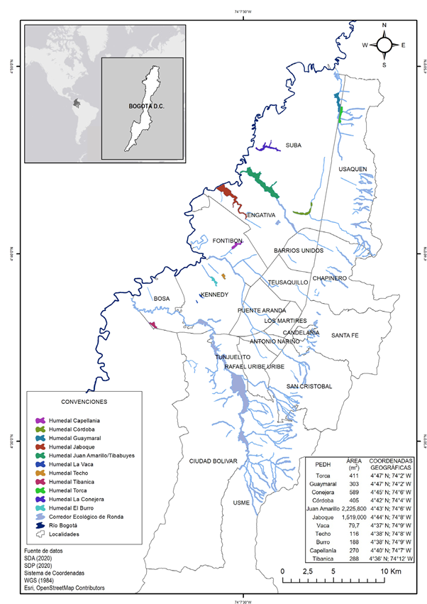 En el departamento de Cundinamarca (Colombia) los humedales han sufrido las transformaciones generadas por las actividades socioeconómicas, por lo que hoy se encuentran en la categoría de peligro crítico de extinción (Etter, et al., 2020). Específicamente en la sabana de Bogotá, los espejos de agua se han reducido en más del 84,5 % de su extensión original por causa de las actividades de urbanización en los últimos 60 años (García-Ubaque, et al., 2020) y ello ha causado un avanzado proceso de fragmentación aislándolos en parches remanentes (Cortés-Ballén, 2018) y provocando que diferentes especies estén al borde de la extinción (Rodríguez-Linares, et al., 2019). En Bogotá algunos humedales se encuentran en los parques ecológicos distritales de humedal (PEDH) bajo la categoría de protección establecida en el Decreto 190 de 2004, además, recientemente han sido incluidos en la lista de humedales de importancia de la Convención Internacional sobre los Humedales (Ramsar) reconocida mediante el Decreto 1468 del 2018. Sin embargo, una buena extensión de estos ecosistemas no está cobijada por ninguna figura de conservación y es vulnerable frente a los efectos de la transformación de la ciudad (Andrade, et al., 2013).