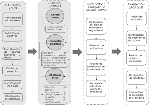 En la etapa de planeación se determinó el problema, los objetivos, el diseño y el levantamiento de información primaria y secundaria de orden social (selección de participantes e instrumentos de educación) y ecológico (especies históricamente reportadas, gremios ecológicos, definición de diseños florísticos y clasificación de coberturas) (Vargas, 2007, 2011; Ceccon, 2013).