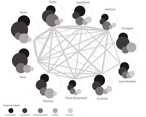 El eje de gestión social adelantado en la etapa de ejecución permitió determinar el contexto histórico en el que se relacionaban los grupos de interés. La red generada permitió detectar 596 agentes para liderar la gestión en estos ecosistemas, lo que facilitó la actualización de las categorías señaladas por Palacio, et al. (2003), con 14 actores y Palacio & Hurtado (2005), con 16 actores. Se evidenció una mayor participación de sectores comunitarios, especialmente en el humedal La Conejera, lo que demostró una fortaleza comunitaria liderada por diferentes grupos de interés que se estaría reflejando en el estado de conservación del ecosistema. Este tipo de participación fue similar en los humedales Córdoba, Tibanica, Vaca y Burro (Palacio, et al., 2003).