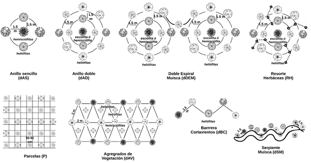 A partir de la clasificación de coberturas fue posible evidenciar que el 56,5 % de la superficie de los humedales correspondió a vegetación acuática, el 40,5 % a vegetación terrestre y el 3 % a infraestructura (senderos, edificaciones y afines); esta clasificación se socializó en diferentes espacios con los participantes de las categorías establecidas, con el fin de concertar las áreas de cobertura terrestre sobre las cuales se llevó a cabo la intervención. Asimismo, el producto de la información recopilada mediante los instrumentos de educación ambiental sobre el uso tradicional de las especies, su relación cosmogónica y su ecología permitió definir la selección inicial de las especies que luego se ajustó con base en la revisión bibliográfica. Además, se determinó la forma de ubicación espacial de las especies (Tabla 1S,https://www.raccefyn.co/index.php/raccefyn/article/view/1406/3153), por ejemplo, en el humedal Tibanica se desarrollaron diseños étnicos muiscas como la serpiente (dSM) y la doble espiral (dDEM).