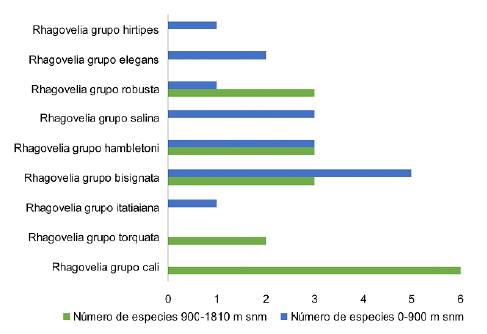 Figura 4 Grupos del género Rhagovelia, número de especies y distribución altitudinal en el piedemonte andino-pacífico en el departamento de Nariño, Colombia