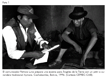 Un ejemplo concreto del proceso por medio del cual se involucra la comunidad en la realización es la siguiente descripción de la producción del video de ficción Markasan jucha thakahuipa (Justicia de nuestros pueblos, 2005) sobre justicia comunitaria en un pueblo aymara de Oruro. En él, a partir de la recreación de un robo de llamas, se detallan los procedimientos que realizan los dueños, las autoridades y los integrantes del grupo para encontrar y castigar a los bandidos (foto 2). "Aprovechamos el rodeo de burros para mostrar la reunión de la gente, ahí se supone que agarran al ladrón", plantean los productores y actores, quienes se valieron de celebraciones locales para realizar algunas escenas, que crearon en ciertos momentos confusión entre la gente que no sabía si el arresto era real o falso. Además, para definir cómo castigar a los culpables el equipo buscó la asesoría de curanderos y autoridades tradicionales:
