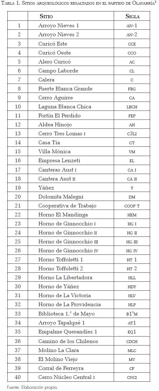 Como resultado de la sistematización de la información arqueológica disponible, se han listado preliminarmente cerca de cuarenta entidades y sitios arqueológicos del partido de Olavarría (tabla 1), aunque se debe destacar que aún no se encuentran todos incluidos, principalmente aquellos que forman parte del vasto patrimonio arquitectónico de la ciudad (véase Arabito 2009).