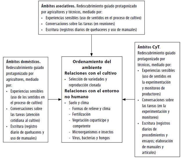 En la producción de conocimiento sobre el cultivo que se desarrolla cotidianamente en las chacras de indígenas y criollos, en ámbitos asociativos y de CyT, analicé cómo la sociabilidad técnica implica un redescubrimiento guiado, en el que la información se vuelve conocimiento, con base en la participación en actividades con aquellos más experimentados. Procuré mostrar qué conocimientos concretos se producen en el ordenamiento del ambiente destinado a proteger el crecimiento del cultivo, señalando que la identificación de variedades, el suelo, el clima y los microorganismos son las dimensiones principales que se ponen en juego. Asimismo, mencioné de qué manera las experiencias sensibles tienen lugar incluso en los espacios de CyT (para detectar virosis, por ejemplo), que las conversaciones sobre las tareas son fundamentales para traducir expresiones de un ámbito a otro (en descripciones sobre el uso de maquinaria que se ponen en común en el clúster, entre otras) y que la información sistematizada por medio de la escritura también está presente en las chacras (en manuales y ensayos que se realizan en conjunto, etc.).
