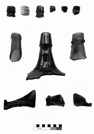 Figura 5 Arriba: picos de botellas de vino, licor y damajuana. Abajo: bases de botella de vino, jerez y ginebra. Todos correspondientes a 1870-1880 y 1920-1930