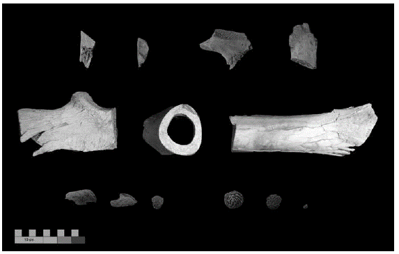 Se hallaron 316 elementos arqueofaunísticos, de los cuales 103 pudieron ser reconocidos (32,59 °%), 25 resultaron irreconocibles (7,91 °%) respecto a orden y especie, mientras que 188 fueron considerados astillas. La gran cantidad de estas (59,49 % de la muestra) sugiere un alto grado de fraccionamiento de las presas o animales consumidos, acción que posiblemente estuvo orientada a optimizar al máximo el aprovechamiento cárnico. Si bien los elementos indeterminados no pudieron ser asignados a un género o especie, sí fueron reconocidos -en su mayoría- como elemento anatómico determinado. En la tabla 6 se pueden observar los diferentes taxones identificados y su respectiva proporción dentro del registro. Cabe mencionar que en la muestra no se han podido determinar huesos de microrroedores ni reptiles, aunque su representación pudo ser identificada en las huellas detectadas en los registros.