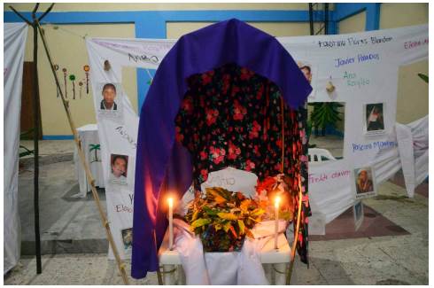 Lo anterior podría tener un correlato en la obra de teatro realizada por un grupo de jóvenes renacientes27 en el primer aniversario de la masacre. Una mujer bellavisteña me compartió lo siguiente: "en la obra nosotros hicimos presentes a los difuntos, les enviamos cartas y bailamos con ellos". La obra se llamó Los muertos hablan: "la gente piensa que ellos [los muertos] no hablan28 o que no están. Y ellos están, ellos viven ahí, con uno, con su pueblo" (notas de campo, 2013).