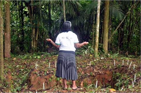 Por otra parte, el sostenimiento de un ciclo ritual y colectivo con los muertos ha puesto de presente la innovación, creatividad, cambio y espontaneidad de los trabajos orientados a los muertos. Si bien las prescripciones rituales mortuorias se han transformado (cantar alabaos en actos públicos distintos a velorios, novenas y entierros; hacer un gualí en el polideportivo del pueblo; enterrar en lugares de disposición transitoria, entre otras), las prácticas y quienes las agencian mantienen un nodo para su realización que se expresa, moldea o transforma con respecto a los modos tradicionales de concebir la muerte y la vida en el Medio Atrato. Existe, además, otro conjunto de vínculos que desborda el campo ritual tradicional orientado a rezar, cantar, acompañar, velar y despedir a los muertos. Nuevos actores, con intereses diversos y concepciones sobre la vida y la muerte distintas a las de las comunidades del Medio Atrato, pero adscritos a las múltiples perspectivas y moralidades forjadas por los "escenarios transicionales", dinamizan también el entramado de lazos que mantienen presentes a los muertos en la experiencia cotidiana de los vivos. El conjunto de prácticas múltiples y diversificadas para relacionarse con los muertos ha configurado un entretejido que implica una dimensión ritual, pero también la excede con el objetivo de saldar la deuda mantenida por más de dieciocho años entre los sobrevivientes y los muertos que dejó la masacre de Bojayá.
