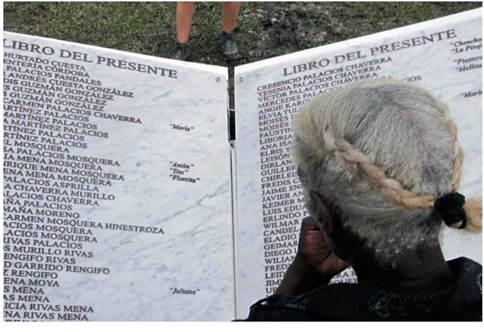 Otro ejemplo. Con ocasión de la undécima conmemoración/aniversario, se inauguró una escultura en homenaje a los muertos en lo que hasta ese entonces se llamaba la plaza central del pueblo. En horas de la mañana, cuando un grupo de jóvenes cavaba el hueco para su instalación, me acerqué con unos colegas e indagamos por el origen de la iniciativa. Herling, representante de una de las organizaciones de víctimas de Bellavista y participante activo de las obras de teatro presentadas cada 2 de mayo, nos contó que el Libro de mármol, una escultura con el nombre de las víctimas mortales, había sido propuesto por la alcaldía. Indagué por la participación de las víctimas o la comunidad en el proceso y me contestó que el libro había sido encargado sin necesidad de consulta alguna. Mientras el sudor bajaba por el rostro de los jóvenes a cargo de la tarea de instalación, llegó un hombre paisa con los botones de la camisa desapuntados que dejaban ver una cadena de la que colgaba una cruz de tamaño muy generoso sobre su pecho. Herling se apresuró a presentárnoslo: "él es el de la idea del libro". Tras una presentación formal, nos contó el sentido de su obra: "aquí la gente se olvidó de sus muertos, y yo quería brindarle algo al pueblo, para que la memoria de lo que ocurrió, no se olvide [...]. Un día le dije al alcalde de la idea y así fue que fue posible" (notas de campo, mayo del 2013).