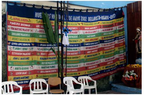 Figura 2 Telón Nuestras víctimas, 2 de mayo del 2002, Bellavista-Bojayá-Chocó. Haciendo historia, bordando memoria, expuesto en la iglesia de Bellavista Viejo durante la decimosexta conmemoración de la masacre de Bojayá