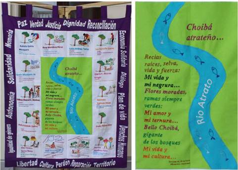 Otro telón tiene como centro al río Atrato, acompañado de un poema y del árbol de choibá. El telón (figuras 3 y 4) muestra pequeñas escenas de la vida cotidiana, objetos, alimentos, oficios, cuerpos de mujeres y hombres que hacen la vida en el día a día de la cuenca del Atrato; en estas escenas las personas están acompañadas por un árbol, el choibá, que le da el nombre a su grupo. Como dice una de las fundadoras, Luz Romaña, este árbol representa la fuerza (por la resistencia de su madera) y el duelo por lo que han perdido en medio de la guerra (en sus flores moradas). El telón está enmarcado por palabras bordadas con hilo blanco que dan cuenta de los valores, principios y proyectos del grupo Artesanías Choibá durante sus veinte años de trabajo.