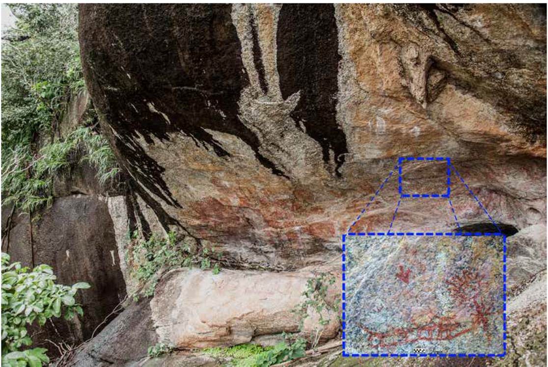 El panel analizado se encuentra en un abrigo de roca granítica de unos 15 metros de largo, en un área que no ha sido alcanzada por la cubierta oscura de liquen y que preserva por tanto su color claro. Algunas partes de la superficie se han ido desprendiendo, mientras que otras están cubiertas por termitas (Isoptera). Asimismo, el humo de fogatas producidas hasta periodos recientes dentro del abrigo ha hecho que se oscurezcan algunas partes de la pared.