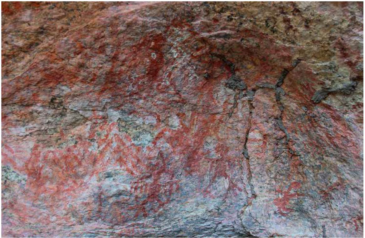 De acuerdo con Bahn (2010), se hace imposible determinar de manera inequívoca las figuras que se observan en este abrigo, puesto que las lógicas visuales y las concepciones de mundo a partir de las cuales pudieron ser realizadas posiblemente se basen en formas muy distintas de concebir y representar la realidad o el mundo supranatural. Sin embargo, desde una perspectiva contemporánea se pueden observar diversas figuraciones e incluso temas iconográficos que cabría interpretar como figuras antropomorfas que a veces aparecen con objetos como lanzas; cadenas de figuras; grupos de figuras; figuras zoomorfas que incluyen insectos como ciempiés y arañas; batracios y serpientes; mamíferos, como perezosos, monos y murciélagos; y aves o seres zoo-antropomorfos con forma de humano y de pájaro (figura 6). Observamos asimismo representaciones geométricas, como por ejemplo formas que podrían recordar la imagen de dos soles unidos o de un sol y una luna, la forma de una cruz concéntrica, líneas en forma de grecas, zigzag, figuras romboides, sucesión de líneas paralelas, etc.
