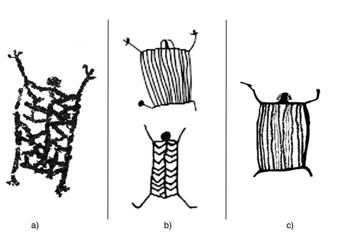 Figura 7 De izquierda a derecha: a) figuras humanas en el abrigo de Punta Brava, b) serie de figuras humanas registradas por John y Marvin Greer en el Orinoco Medio, y c) figura humana registrada por Carlos Castaño Uribe en Chiribiquete, Colombia