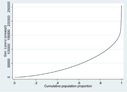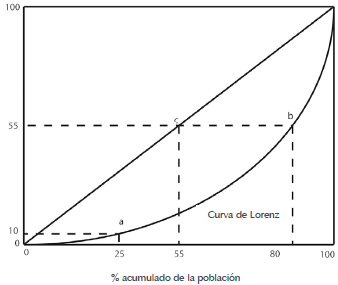 La elaboración de la curva de Lorenz se da partiendo de n individuos ordenados de manera ascendente respecto al valor que estos posean de la variable Y. De este ordenamiento se conforman grupos de igual tamaño, llamados percentiles (los grupos más usados son: con el 10% de la población, que se llaman deciles; con el 20%, quintiles, y con el 25%, cuartiles). Por tanto, la curva de Lorenz (figura 8) muestra la relación que existe entre los porcentajes de la población y las proporciones acumuladas de la variable (Medina, 2001).