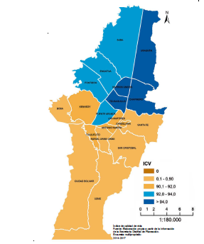 En relación con el Indice de Condiciones de Vida (ICV), (tabla 1, figura 3) desagregado por localidad, se pudo determinar que el promedio de las localidades es de 92 puntos. Aquellas con el peor índice fueron Ciudad Bolívar y Usme, con puntajes de 87,6 y 88,3, respectivamente (aproximadamente, 4 puntos porcentuales por debajo, en comparación con el promedio). Cabe agregar que, si bien el índice determina condiciones diferentes de los ingresos, dichas localidades también eran las que tenían los porcentajes más altos respecto al indicador de pobreza monetaria; así mismo, las localidades que se encontraron por debajo del promedio son: Santa Ee, Bosa, San Cristóbal, Rafael Uribe, Tunjuelito, La Candelaria, Antonio Nariño, Kennedy y Los Mártires.