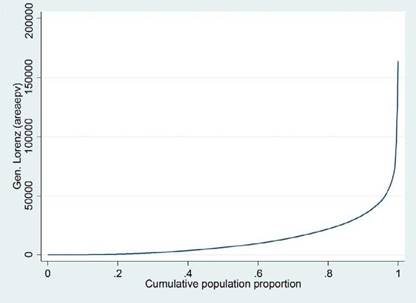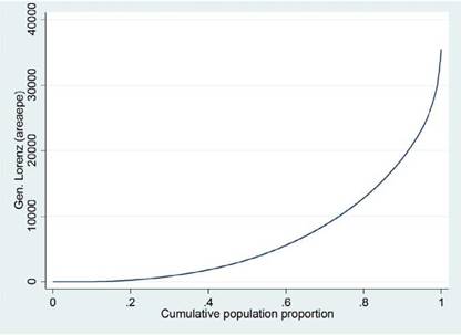 La forma como la curva muestra gráficamente la distribución está dada por la línea de equidad perfecta. Dicha curva, de 45°, se formaría intuitivamente si a cada uno de los individuos le correspondiera el mismo porcentaje de la variable, lo cual denotaría ausencia de desigualdad. Esta línea sirve como referente para delimitar (conforme a la distribución que tenga la variable) lo que se llamará área de concentración, la cual permitirá evidenciar la desigualdad y servirá como base para el cálculo de los diferentes índices.