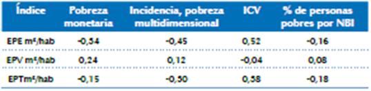 Al hacer nuevamente la correlación, pero ya no respecto al total de m2 de la localidad, sino a los m2/hab (tabla 4), los índices de correlación fueron mayores en términos absolutos, aspecto que resalta lo que ya se mencionó: en las localidades pobres, al ser más densas, su déficit de espacio público se ve reforzado en términos per cápita. Respecto al indicador de EPV, este presentó resultados más alentadores en términos de focalización, pues presenta una relación débil, pero positiva, aunque muestra la misma tendencia en términos por habitante.