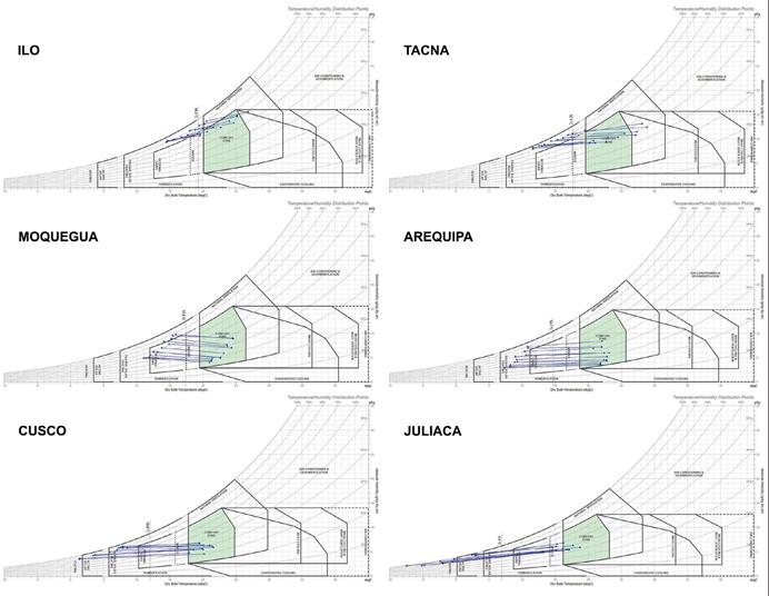 Figura 2 Ábacos psicrométricos con representación de días típicos, zona de confort y estrategias de diseño.