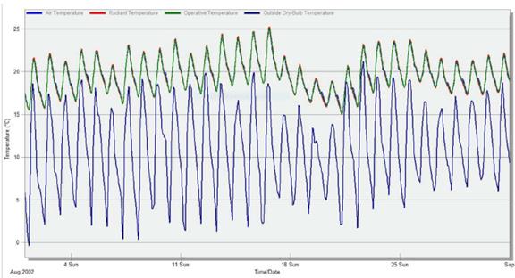 En segunda instancia, se presentan los resultados de las simulaciones dinámicas realizadas en cada uno de los climas, considerando ambientes con ausencia de equipos de climatización artificial. Dichas simulaciones se realizan mediante la herramienta informática Design Builder 4.58. Los resultados del comportamiento de la temperatura interior se valorarán finalmente en función de la capacidad para proveer confort térmico a los usuarios.