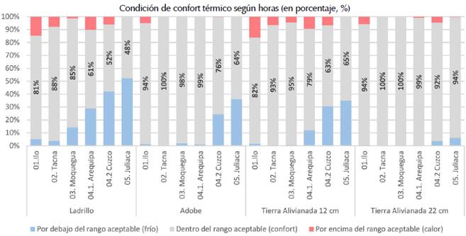 En la medida en que los climas son más fríos, los materiales ligeros evidencian serias limitaciones a la hora de mantener el confort en horas de la noche y la madrugada. Es significativamente notorio lo que ocurre con la construcción de ladrillo, con casi la mitad del tiempo en situación de disconfort para el caso de la ciudad de Julia-ca, la más alta y fría incluida en el presente trabajo. A pesar de contar con recursos pasivos para elevar la temperatura interior, esta termina muy por debajo de los límites mínimos requeridos. En relación con la solución de muros de tierra alivianada de 12 cm, aun comportándose mejor que el ladrillo, esta resulta también insuficiente. En ambos casos, la causa principal es el bajo nivel de aislamiento que provee la envolvente.