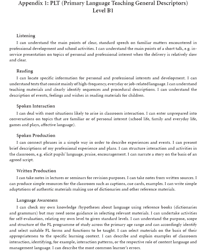 By comparing the document obtained for level B1 (see Appendix 1), with the contents of Common European Framework of Reference, it is immediately clear that, while the former actually contains indications for what concerns the overall language behaviour to be developed by primary language teachers, the latter refers to more general objectives. This can be observed by focusing, for instance, on the following statements referring to listening and reading: