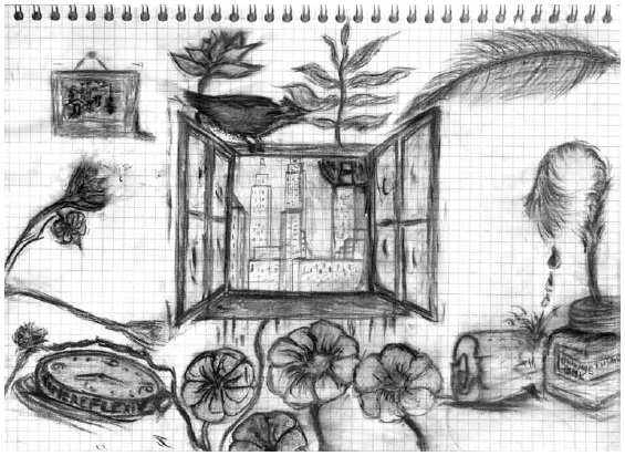 ST3 drew a room in which nature and the city complement each other. In this room there are different objects each of which symbolizes something relevant of the practicum process. There is, for example, a watch representing the amount of time the teaching practicum was allotted. It is also time for reflection. Time for solving problems. Time for diary-keeping. A bird, representing the students' enthusiasm and energy as well as the student teacher's. A picture where there are two people fishing, the underlying message being "Give a man a fish; you have fed him for today. Teach a man to fish; and you have fed him for a lifetime". There is also an ink pot with some drops falling on a kind of oil painting. This represents all the thoughts reflected in the journal as well as all the writing done by supervisors, practi cum peers and students. There is a window which represents the reflective thinking in the practicum. (ST3)