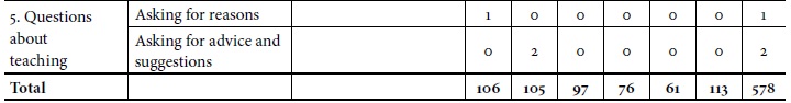 Finally, in the fifth category, which is concerned with asking questions about teaching, one of the student teachers (ST1) wondered what to do with her students' disruptive behavior. Another one recognizes the worth of asking for advice or suggestions, as seen in the following reference: "I have to revise the activities and ask for a second opinion to my practicum advisor or another experienced teacher" (ST2).