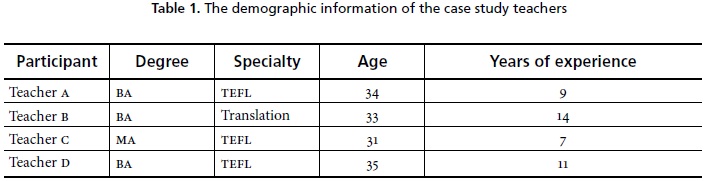 Four EFL female high school teachers, teaching in Babol, a city in the north of Iran, voluntarily took part in the study. Table 1 shows the demographic information of the participants.