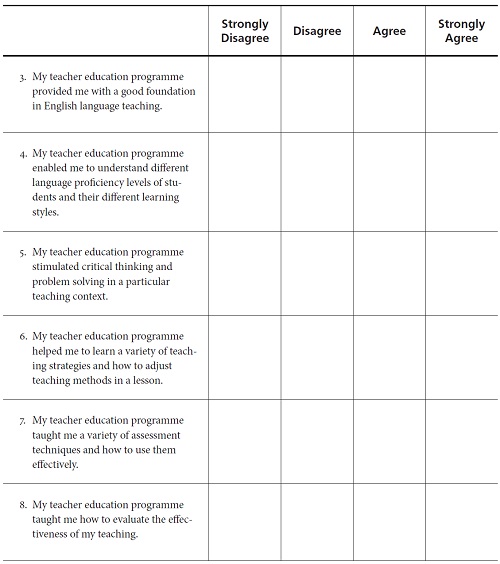 As a final remark, there is a need to collect more data on the teaching experiences of graduates from teacher education programmes in general. Baecher (2012) believes that the lack of data may be preventing TESOL programmes from preparing teacher candidates to work effectively with English language learners. Similarly, Farrell (2008) has characterized the personal, social, and psychological demands faced by novice English teachers as they struggle to adapt to the realities of their work. Their feedback is invaluable as we undertake to meet the needs of teachers and learners in teacher education programmes.