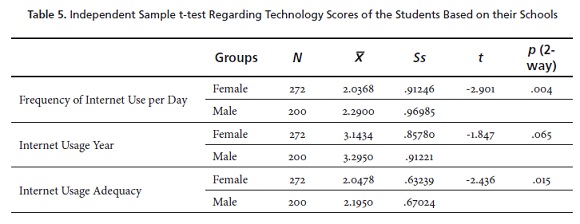Independent two-sample t-tests were used to determine if there are significant differences between Internet usage statuses in relation to the gender of pre-service teachers. Results of the t-test are given in Table 5.