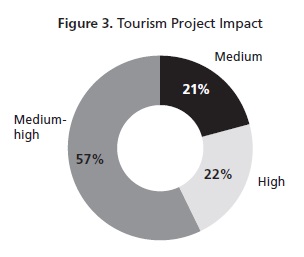 Figure 3 describes the percentages and scales with which students located the impact of the Tourism in Neiva project during the course. When being asked about the impact that the tourism project had in their English language learning process, 79% of the students stated that the project had a high and medium high impact. Among the reasons to justify their answer was the finding that all students admitted that their participation in the different tasks and the use of the materials provided to achieve the tasks objectives facilitated learning English as a foreign language. For instance, students who actively engaged in the conversation club (43%) thought that this task gave them more opportunities to practice the language for real purposes outside the classroom. Despite this high percentage, 21% of the students placed the impact on a medium scale.
