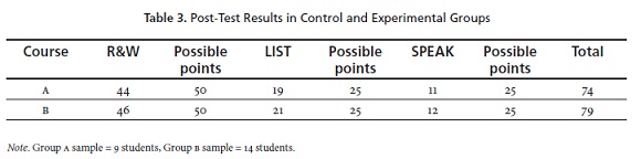 Results of the pre-test can be observed in Table 2. By observing the average total scores it can be concluded that both the experimental and the control groups started with a similar skill level. Although their marks were expected to be higher due to the complexity of the test and the assessment scale, there was a visibly low performance in their listening and speaking skills.