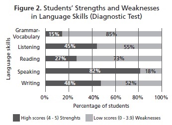 What are the students' strengths and weaknesses in language skills? The focus group, surveys, and diagnostic language test answered this research question. The students' self-perception informed that while listening was their main strength, reading, speaking, grammar, and vocabulary represented their weaknesses. The language test, however, indicated that speaking was the students' strength (Figure 2). This was an accumulative test which evaluated the students' four language skills plus grammar and vocabulary in a separate component. It was administered to the 321 students at the end of the first semester. The results served as a diagnosis of their language level. The test results are presented as high scores (4-5) and low scores (0-3.9) of a grading scale from 0 to 5.