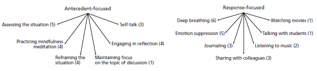 Participants also used response-focused ERSs such as deep breathing (6), emotion suppression (5), journaling (3), sharing with colleagues (3), listening to music (2), watching movies (1), and talking with students (1) to manage the emotions experienced due to SDB. To support these findings, some interview excerpts are provided below.