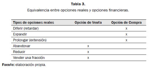 Al tener en cuenta las diversas formas en que las opciones reales pueden aparecer en un proyecto es fundamental saber identificar la opción real dentro del proyecto y su equivalencia con las opciones financieras. La Tabla 3 nos muestra la similitud entre las opciones financieras y las opciones reales.
