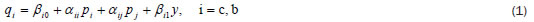 Cada modelo estructural comprende las dos ecuaciones de demanda para cada país exportador, así como las CPO propias de cada interacción estratégica. Los términos μit, i = 1, 2, 3, 4 son los errores conjuntos que, se supone, se distribuyen normalmente con matriz de covarianzas Σ. θi, i = c, b. representa los interceptos y el cambio en la variable de demanda: βi0 + β i1 en los modelos de precios y γi 0 + γi1y en los modelos de cantidades.