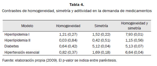En cuanto a las restricciones de homogeneidad y simetría, se consideran supuestos importantes en la teoría de demanda, y consistentes con un comportamiento de maximización de utilidad por parte del consumidor. En la tabla 4 se muestran los resultados del test de Wald que se realizó para probar la hipótesis nula de homogeneidad, simetría, y homogeneidad y asimetría conjuntamente.18 Los resultados indican que en la mayoría de los casos las restricciones no son rechazadas a un nivel de significancia del 5%, con excepción del grupo II de hiperlipidemia, lo cual podría ser explicado debido a que en este caso el índice de precios elegido no muestra patrones y hábitos de consumo para esta población. Sin embargo, siguiendo a Parkin (1998), dichas restricciones no siempre son tratadas como restricciones verificables, sino que se asumen como ciertas y, por ende, se imponen en el sistema de demanda, de ahí que, basándose en este argumento, el modelo se estimó imponiendo dichas restricciones.