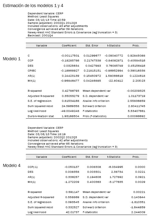 La estimación del modelo inicial (FF1) muestra un ajuste muy bajo y con signos algo contradictorios. De las restantes formas funcionales exploradas, el modelo 4 es el que mejor bondad estadística muestra a nivel global.15 En él no figura el comportamiento del PIB, ya que resultó estar relacionado linealmente con el consumo privado, ni tampoco el intercepto, pues la CERP, al estar capturada en desviaciones estándar (debido a la normalización) inicia muy cerca al valor de cero, como lo mostraron las figuras anteriores. Adicionalmente cumple con los signos esperados, la bondad de ajuste es alta, al igual que su significancia estadística.16