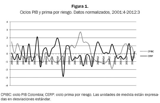 Al revisar la relación entre el PIB y la prima por riesgo (ERP) se muestra que la correspondencia es contracíclica, ya que el coeficiente de correlación es negativo (-0.28). Esto indica que las expansiones de la economía están asociadas a contracciones en la ERP; por lo tanto, cuando la economía colombiana experimenta altos niveles de actividad económica, la prima por riesgo experimenta bajos niveles. La figura 1 muestra este resultado.