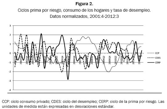 c. Finalmente, aun con las limitantes de información, el hallazgo estadístico para Colombia se suma a la evidencia encontrada en los referentes externos, en el sentido de que la prima por riesgo se comporta de forma contracíclica con respecto a la actividad económica, en este caso manifestada en las series de la tasa de desempleo y el consumo privado.