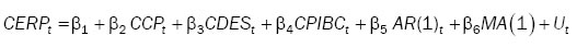 Por el lado del proceso autorregresivo AR(1), se evidencia que la prima por riesgo no cambia de forma muy rápida de un trimestre a otro, es decir, no es muy fluctuante, por lo menos no para dos trimestres consecutivos. Finalmente, el proceso MA (1) muestra que la prima por riesgo depende de choques aleatorios externos de forma no contemporánea, de los cuales se desconoce su origen pero podrían provenir de causas exógenas a la economía como implementaciones de políticas o aspectos de carácter social.